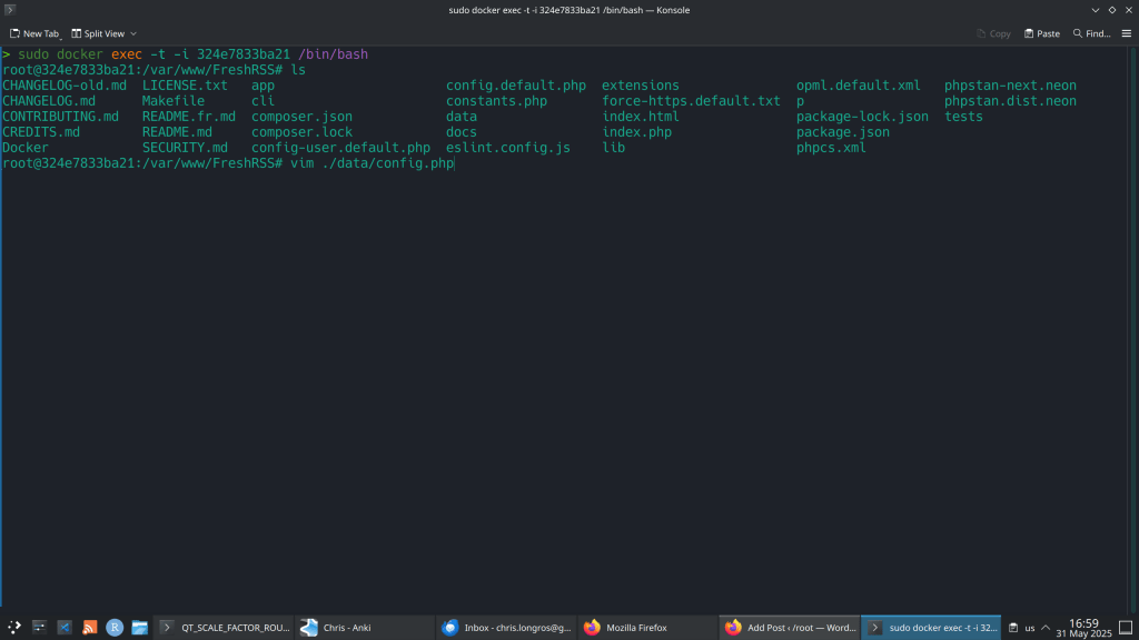 - ~ > sudo docker exec -t -i 324e7833ba21 /bin/bash (to browse the docker container config files)