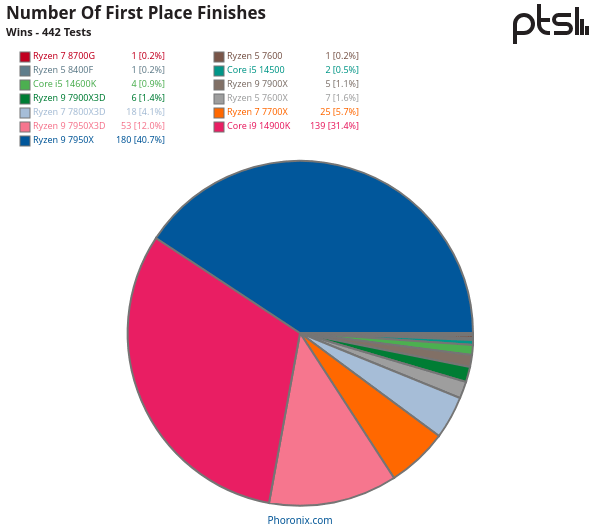 “Coming in first place most often was the Ryzen 9 7950X at 40.7% while the Ryzen 9 7950X3D 3D V-Cache processor led 12% of the time and then the Intel Core i9 14900K led 31% of the time.