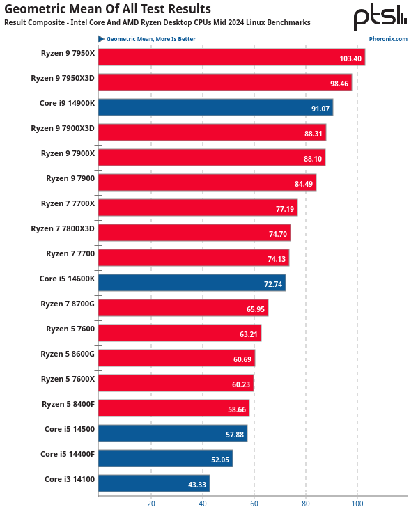 When taking the geometric mean of all the performance benchmark results ran on all 18 processors, the Ryzen 9 7950X was the firm first place performer for this wide range of workloads tested. The Ryzen 9 7950X was 13.5% faster than the Core i9 14900K. The Ryzen 9 7950X3D scored a comfortable second place finish and it was around 8% faster than the i9-14900K.”