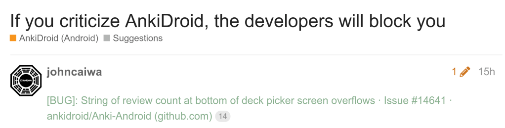https://forums.ankiweb.net/t/if-you-criticize-ankidroid-the-developers-will-block-you/47157