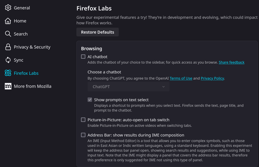“Firefox Labs currently lets you enable an AI chatbot, an auto-open on tab switch feature for Picture-in-Picture, support for Service Workers in the Debugger panel, and an address bar feature that shows results during IME (Input Method Editor) composition.”