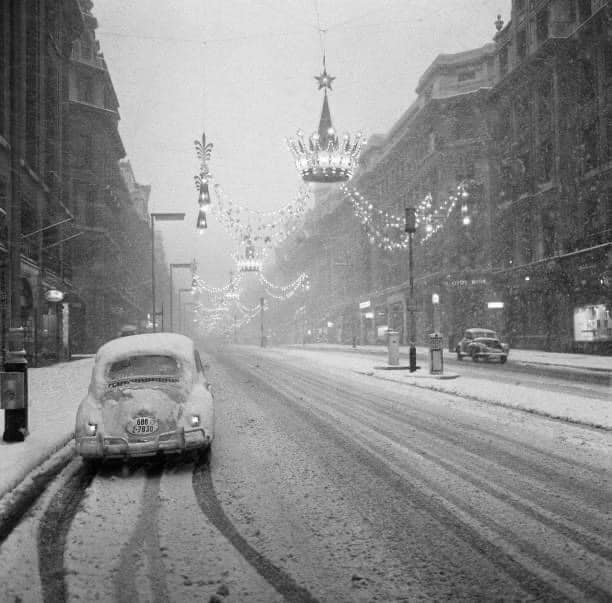 Snowfall on Regent Street on New Year’s Eve, 31st December 1961.