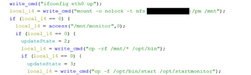 “In the code in Figure 2, the device mounts a remote NFS share from a host at an IP address that is not