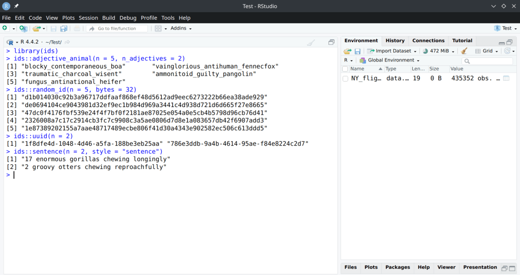 “The ids package provides randomly generated ids in a number of different forms with different readability and sizes.”