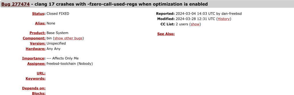 Enabled -fzero-call-used-regs results in a crash instead of an object file according to a new Errata Notice.