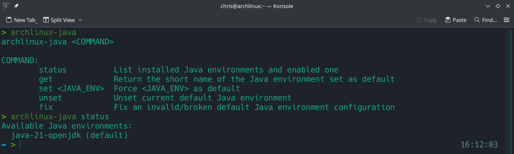 The issue was solved by setting the default environmental Java variable with archlinux-java utility.