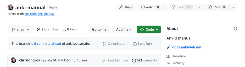 I forked the upstream repo under my name. I activated Actions, Workflows and gh-pages. So the greek version of the manual will be in: https://chrislongros.github.io/anki-manual/. I contacted Damien Elmes to add the link into the ankitects/anki-manual repository.