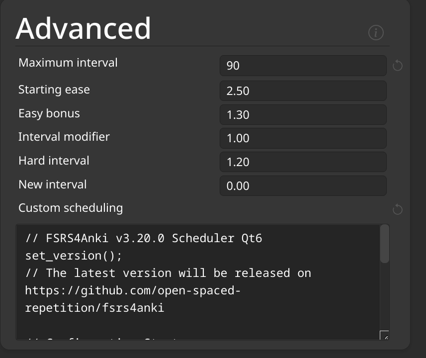 Η εγκατάσταση γίνεται με την αντιγραφή και επικόλληση της εκάστοτε έκδοσης FSRS στο πεδίο custom scheduling. Ο πηγαίος κώδικας βρίσκεται στην ακόλουθη σελίδα: https://github.com/open-spaced-repetition/fsrs4anki/blob/v3.25.4/fsrs4anki_scheduler.js