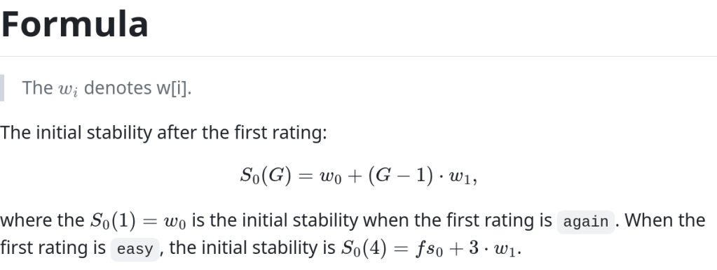 Η αρχική σταθερότητα έπειτα από την πρώτη απάντηση δίνεται από τον ακόλουθο τύπο: (το G συμβολίζει το Grade με το οποίο ο χρήστης απαντά σε κάθε κάρτα)