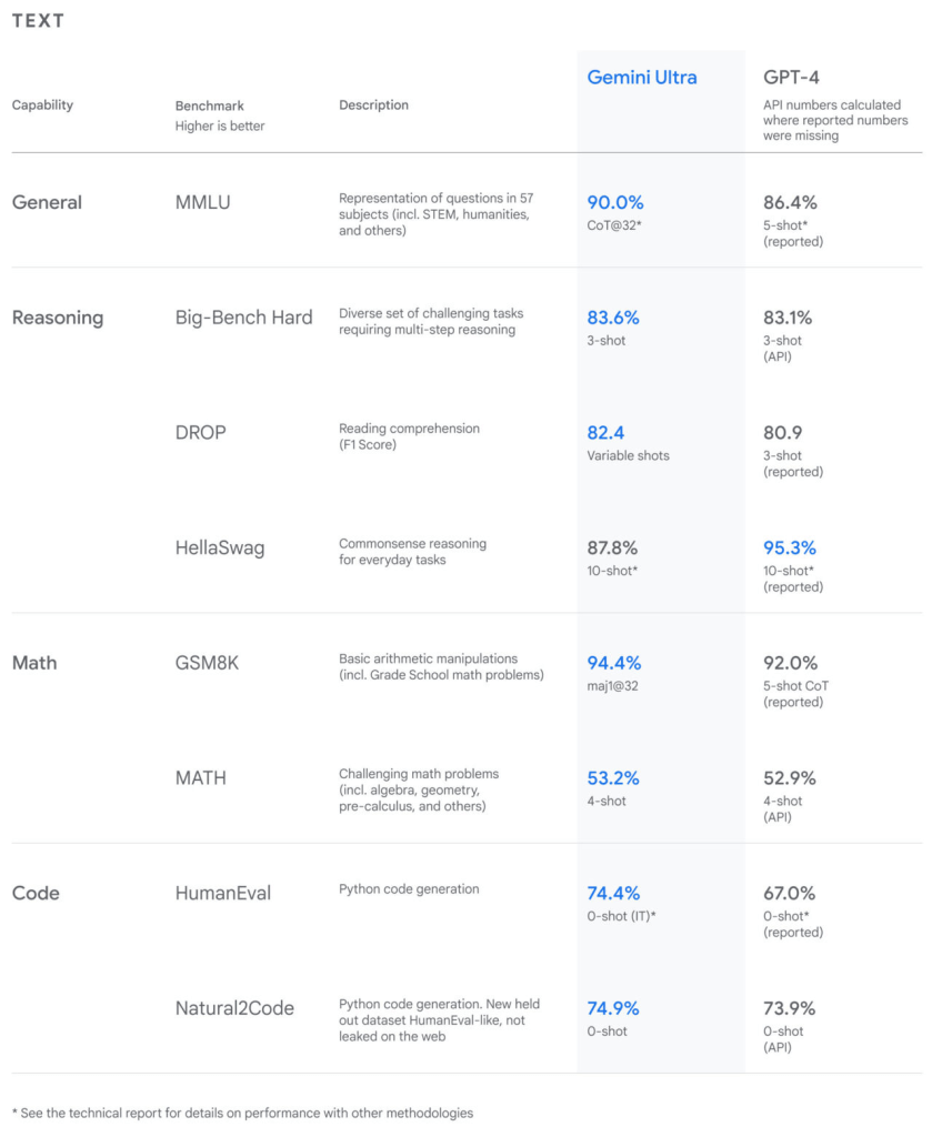 According to Google it outperforms GPT-4 in 30 of 32 benchmarks and it was trained in a dataset 10 times larger than that of GPT-4.