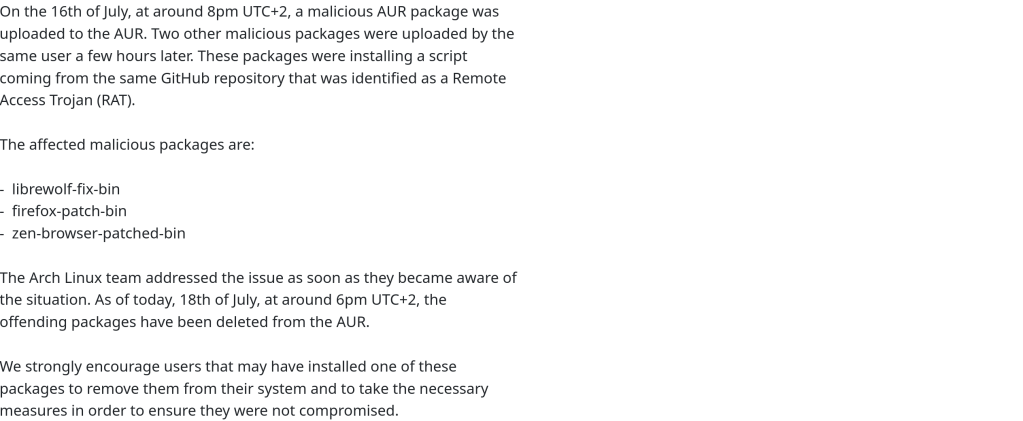 “An Arch Linux user on Wednesday uploaded malicious AUR packages of firefox-patch-bin, librewolf-fix-bin, and zen-browser-patched-bin. These AUR packages ended up installing a binary file from a GitHub repository that ended up being a remote access trojan.”
