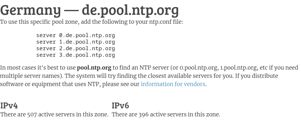 exchanges with a server when contact is first established, to help quickly synchronize system time.The de prefix differs depending on the servers of the country you choose. In my case Germany. A complete list of active servers is on https://www.ntppool.org/en/