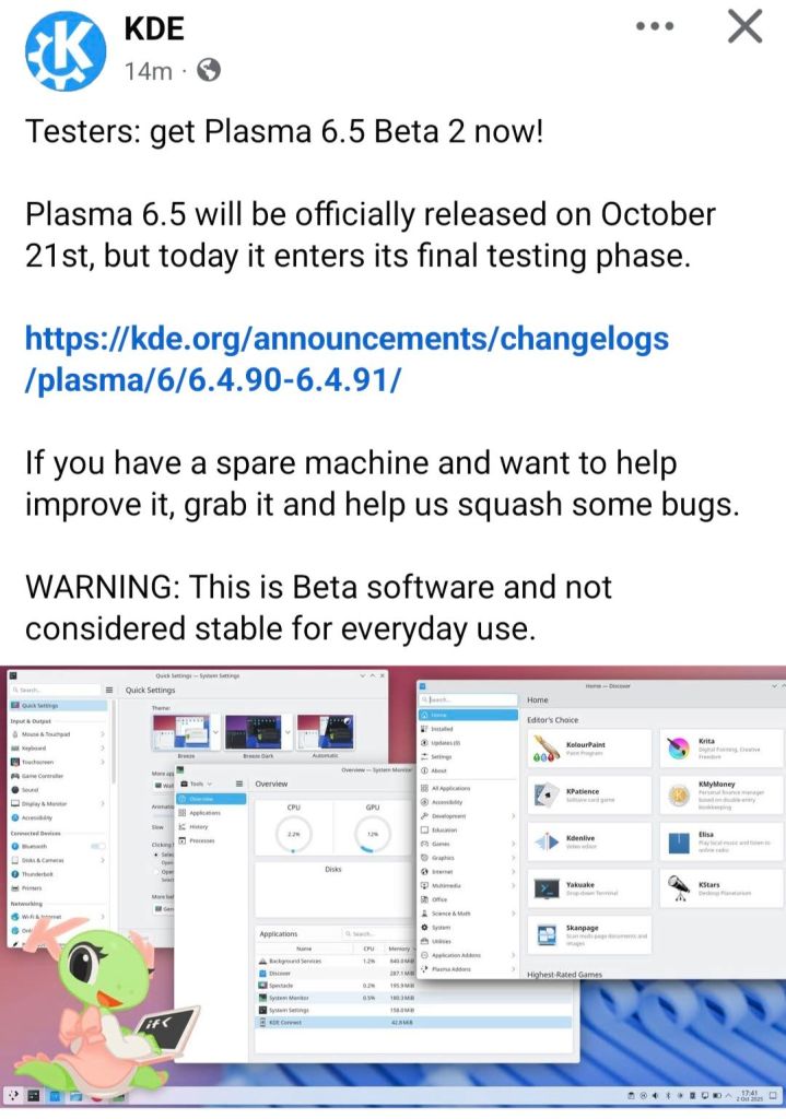 The KDE Plasma 6.5 stable release is scheduled for October 21, 2025. A beta version of Plasma 6.5 was released on September 18, 2025, allowing for public testing.