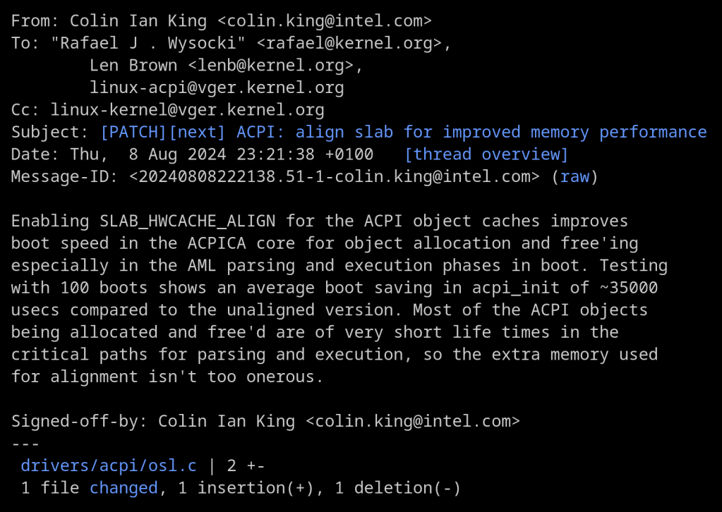 “Testing with 100 boots shows an average boot saving in acpi_init of ~35000