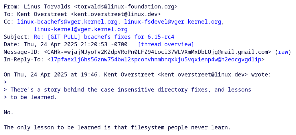 “Dammit. Case sensitivity is a BUG. The fact that filesystem people still think it’s a feature, I cannot understand. It’s like they revere the old FAT filesystem so much that they have to recreate it – badly.