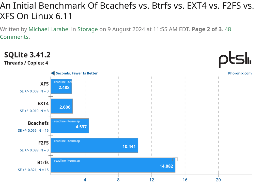 Even Bcachefs that is out like a year and not even that mature has better speeds … XFS was the fastest in almost every benchmark.