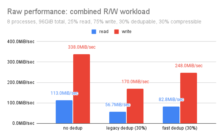 Fast dedup outperforms legacy dedup by almost 25% of the raw performance.“